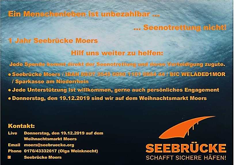 DetailsSehr geehrte Damen und Herren, auch in Moers hat sich eine Gruppe der Seebrücke gegründet, die mit Aktionen und einer Unterschriftensammlung darauf hin arbeitet, Moers zu einem „sicheren Hafen“ zu machen. Unterstützt wird die Seebrücke vom Kreisverband der AWO Wesel e.V., Bündnis 90/die Grünen Moers, Erinnern für die Zukunft e. V., Flüchtlingsrat Moers, Kulturprojekte Niederrhein…
